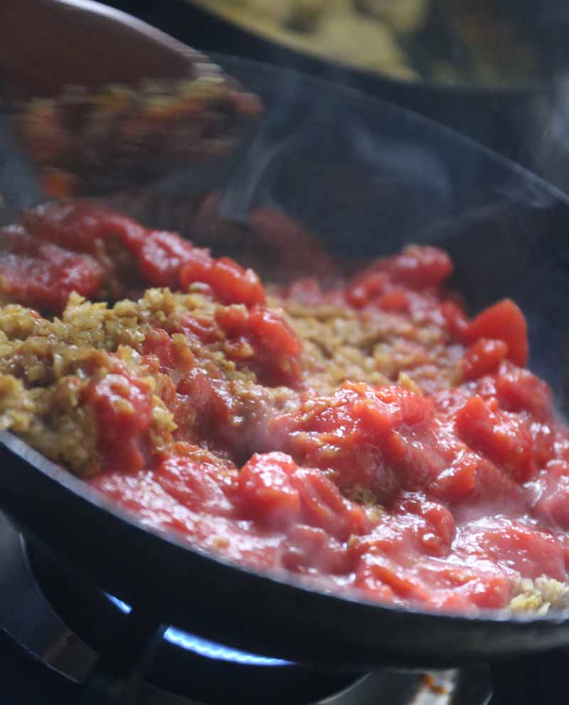 そこにトマト缶を入れ3分ほど少し煮ます(A)