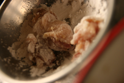 さあ、小さなボールに片栗粉を入れて切り分けた鶏を4〜5分づつ粉と合わせて揚げて行きます。